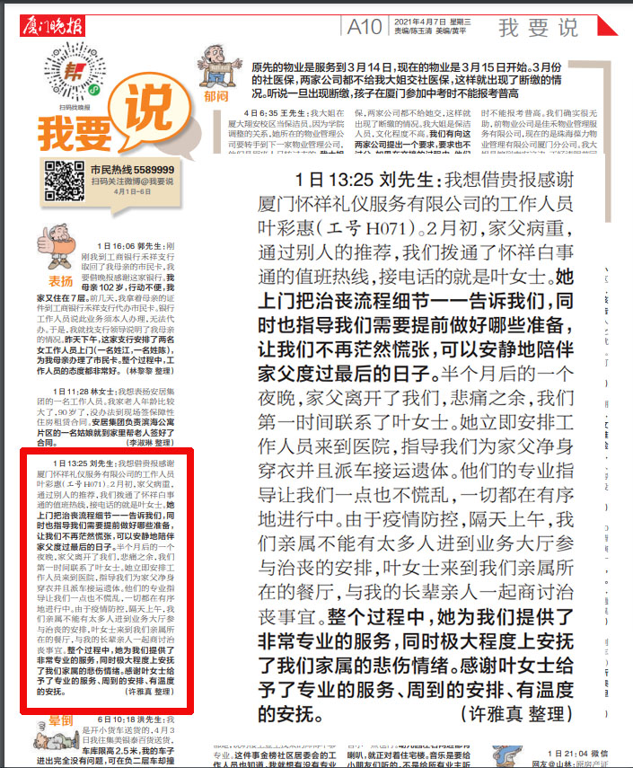 近日,福壽園(廈門(mén))懷祥禮儀服務(wù)有限公司員工葉彩惠獲得逝者劉氏家屬的衷心感謝,并在4月7日《廈門(mén)晚報(bào)》的《我要說(shuō)》專(zhuān)欄上登報(bào)表?yè)P(yáng)。葉彩惠在服務(wù)客戶(hù)過(guò)程中為家屬服務(wù)貼心,百問(wèn)不煩,對(duì)家屬問(wèn)的各種問(wèn)題耐心解答,專(zhuān)業(yè)體貼, 獲得家屬認(rèn)可及感謝。