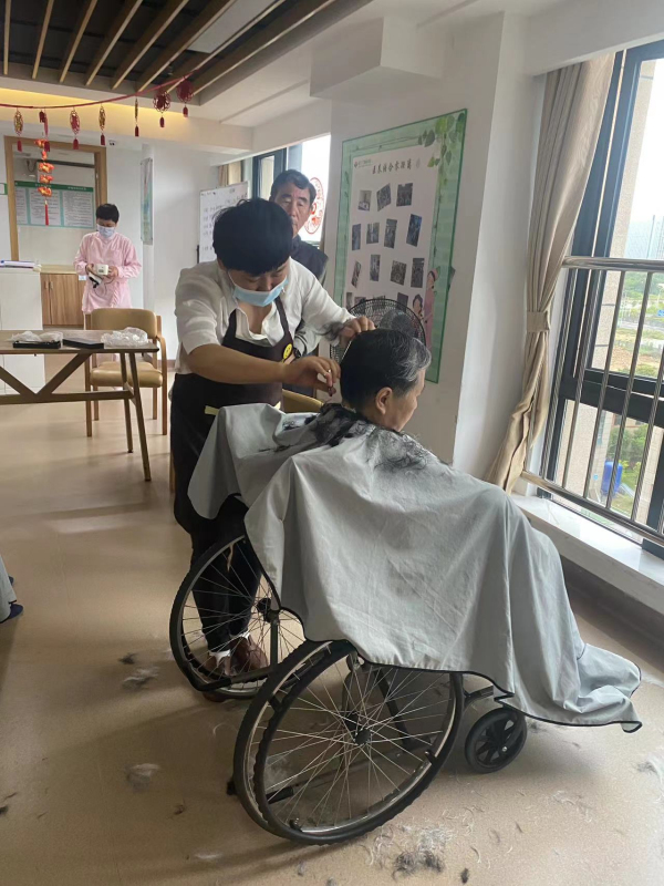 蘭馨頤養(yǎng)院每年都要接待很多志愿者,大多帶著慰問品來打掃衛(wèi)生、表演節(jié)目,老人們喜歡這些熱鬧的活動,但他們的需求不只這些。一次在院內做志愿活動時,有位老人希望福壽康寧社工服務中心志愿幫忙剪以下自己的腳指甲;志愿者們才發(fā)現(xiàn),很多老人都有修腳、理發(fā)的需求。因此從2021年開始,福壽康寧社工服務中心招募了理發(fā)師和修腳技師隊伍,定期前往蘭馨頤養(yǎng)院開展義務服務活動,反響出乎意料地好。