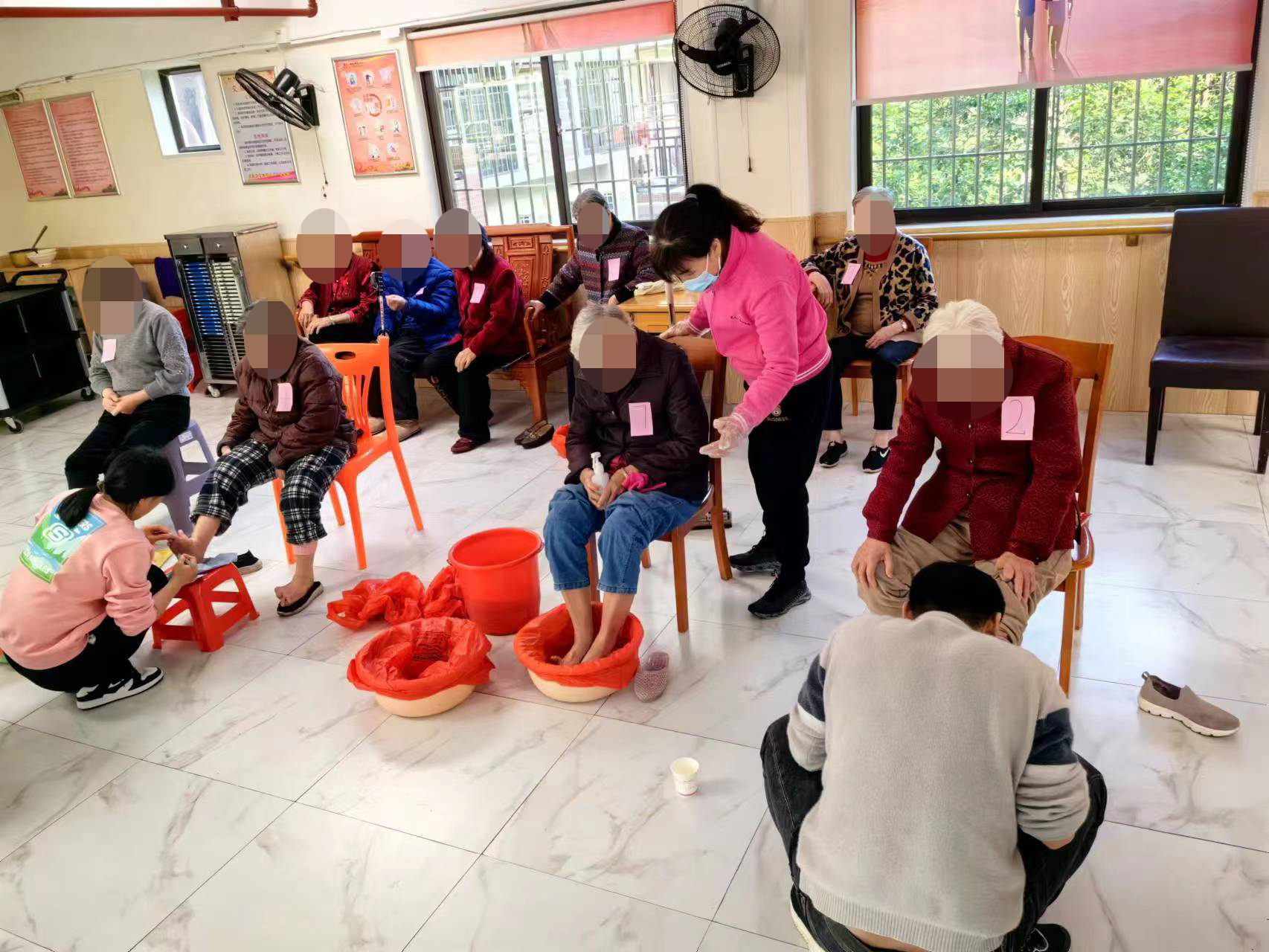 上午9時(shí)許,福壽康寧社工服務(wù)中心志愿者及邀請(qǐng)的修腳技師在伍心養(yǎng)老院內(nèi)集結(jié)完畢,大家一起擺好椅子,并至各樓層將老人護(hù)送到活動(dòng)大廳,老人們排排坐好等待免費(fèi)修腳服務(wù)。泡腳、修腳、穴位按摩,還附送養(yǎng)生保健知識(shí)和聊天,修腳技師們一邊細(xì)心地為老人服務(wù),一邊聊家常,逗得老人們開懷大笑。